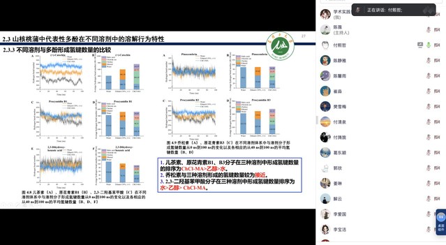 交流会上,新进教师付熙哲以《基于天然低共溶剂的山核桃蒲多酚提取、鉴定及溶解行为研究》为主题,进行了交流,生动讲解了山核桃这类农产品的高值开发;新进教师赵月以《基于东莨菪碱诱导的小鼠痴呆模型探究海参蛋白肽改善记忆的作用机制》为主题,进行了交流,运用小鼠痴呆模型分析海参蛋白肽的作用,并进一步探究海参蛋白肽改善记忆的作用机制。攀登计划汇报人王月以《芥酸在神经退行性疾病中的保护作用及分子机制》为题展开汇报;攀登计划汇报人郑晓春围绕《线粒体信号肽的表征以实现红酵母中柠檬烯生产区室化》进行汇报,详细讲述了线粒体信号肽对红酵母柠檬烯生产区室化的作用。优秀学生许玲霞以《亚麻籽蛋白质与特定醛类挥发性风味物质相互作用的研究》为主题,进行了交流,进一步剖析了亚麻籽蛋白质与风味物质之间的相互作用。